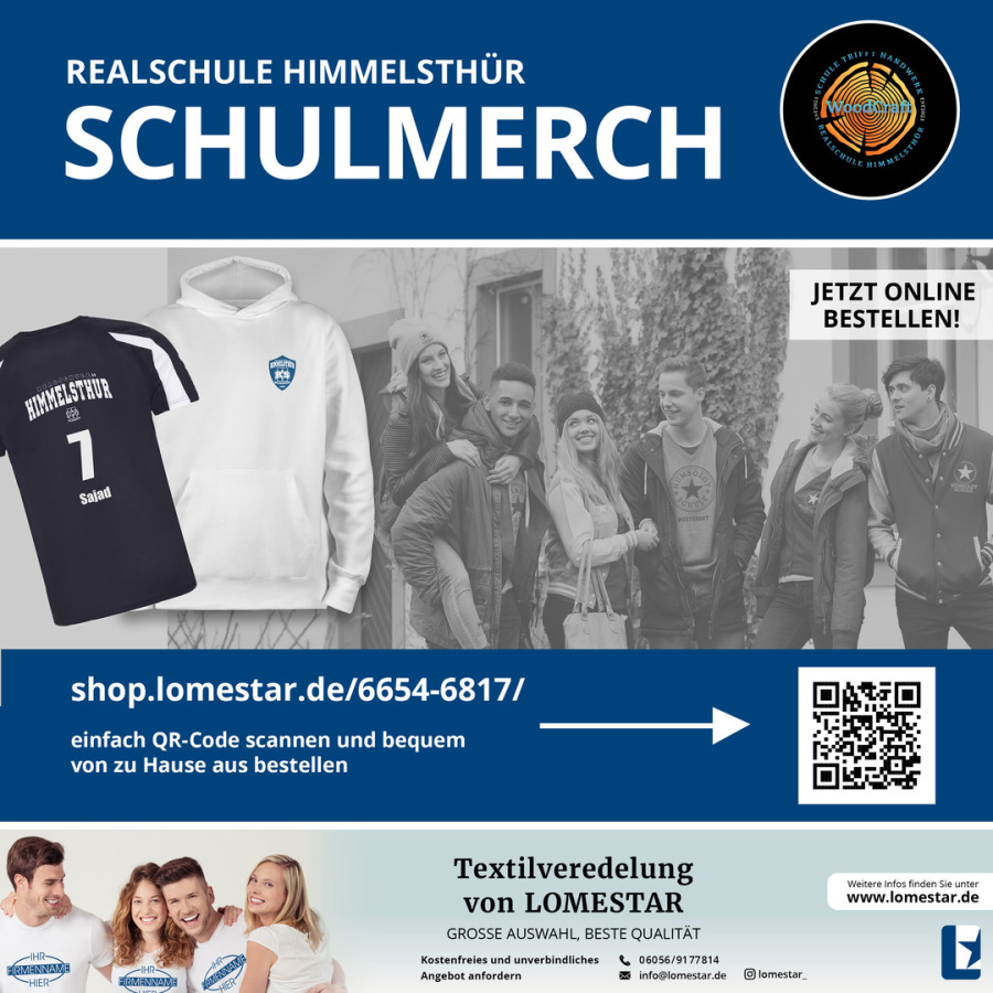 Neben den Holzprodukten hat „WoodCraft“ auch das neue Merchandise-Sortiment der Realschule Himmelsthür entwickelt. Schon bald können Jacken, Hoodies und T-Shirts mit dem Schullogo erworben werden. Ergänzend dazu wird es personalisierte Trinkflaschen, iPad-Hüllen und weitere Artikel geben, die Schulkleidung in neuer Form und Farbe präsentieren.