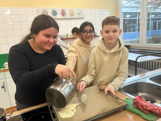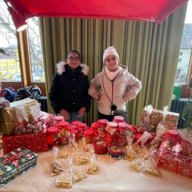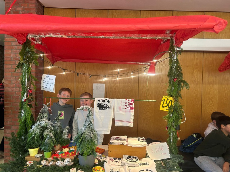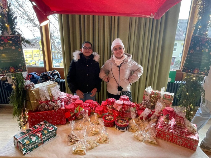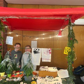 Auch in diesem Jahr herrschte an der Realschule Himmelsthür am ersten Adventssamstag eine besondere vorweihnachtliche Atmosphäre. In den zwei Projekttagen zuvor wurde in allen Klassen eifrig gebastelt, gebacken und gewerkelt. Die Ergebnisse konnten sich sehen lassen: An den festlich geschmückten Ständen präsentierten unsere Schülerinnen und Schüler eine Vielzahl liebevoll hergestellter Produkte – von handgefertigtem Weihnachtsschmuck über dekorative Geschenkideen bis hin zu köstlichen Plätzchen und anderen Leckereien. Eine Premiere feierte in diesem Jahr die parallel stattfindende Kunstausstellung in der Aula. Dort wurden beeindruckende Arbeiten aus dem Kunstunterricht sowie Beiträge zu verschiedenen Wettbewerben ausgestellt. Viele Besucherinnen nutzten die Gelegenheit, die kreativen Werke in Ruhe zu betrachten. Wie gewohnt erfreute sich auch die gemütliche Kaffeestube im Musikraum großer Beliebtheit. Bei frisch gebrühtem Kaffee, heißem Kakao und einer Auswahl an gespendeten Kuchen und Torten konnten sich Jung und Alt eine Pause gönnen und die adventliche Stimmung genießen. Am folgenden Montag wurden viele der selbst gestalteten Produkte zusätzlich am Stand der Schulen auf dem Hildesheimer Weihnachtsmarkt angeboten. Auch dort fanden die kreativen Arbeiten großen Anklang und trugen zu einem erfolgreichen Verkaufstag bei. Der Erlös ist für die Kinderkrebshilfe bestimmt. Wir bedanken uns herzlich für die zahlreichen Kuchen- und Keksspenden sowie für die tatkräftige Unterstützung vieler engagierter Eltern. Dank der Einnahmen aus dem Weihnachtsmarkt kann der Förderverein auch in diesem Jahr wieder den traditionellen Kinobesuch unserer Schülerinnen und Schüler vor den Weihnachtsferien unterstützen.